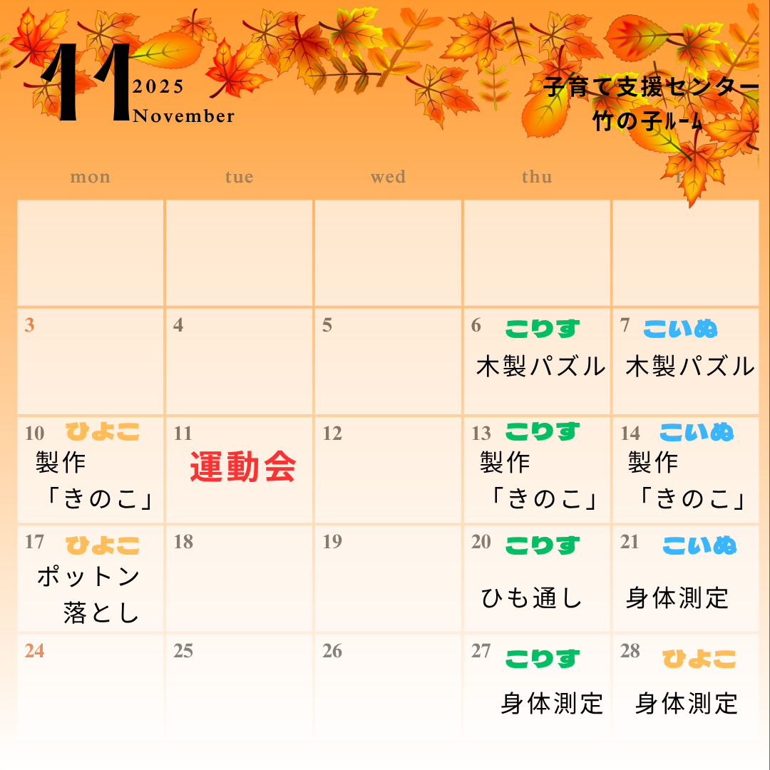 11月11日(火)竹の子ルームにて運動会を行います。ハイハイレースや玉入れなど親子で楽しく体を動かしたと思います。ぜひご参加お待ちしています。