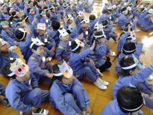節分祭では、みんなが作ったお面をかぶって遊戯室に集合。