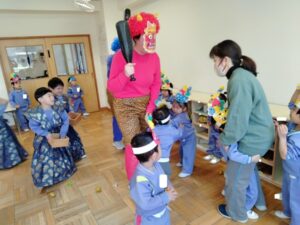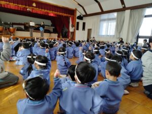 節分の由来や鬼のお話、節分クイズなどを楽しみ、鬼が現れなかったことにホッとした様子の子も見られました。