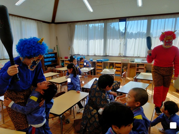 集会が終わり、クラスでゆったり過ごしていると…突然、鬼が登場。