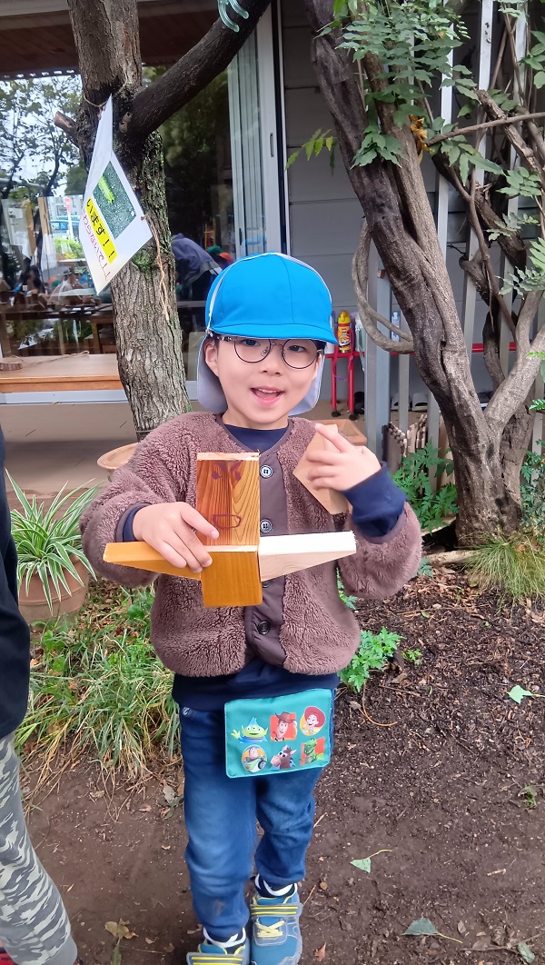 ノコギリやナタで切ってもらったり、グルーガンやダボで接着してもらい、自分の作品が完成!!
