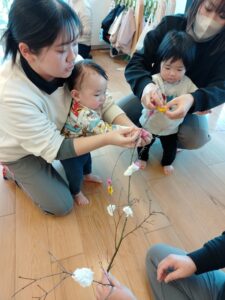 2歳さんはお餅を使って、0,1歳さんは花紙を使って繭玉づくりをしました!