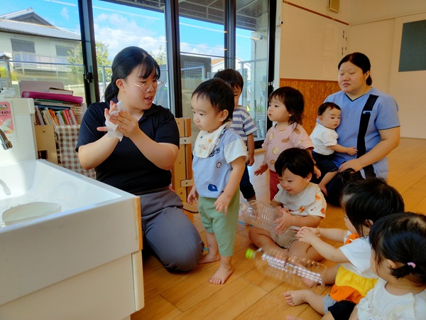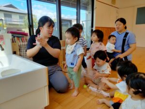 子ども達が手洗いをするときにも、「手洗いはお水を止めてゴシゴシしようね!」を合言葉に行っています。