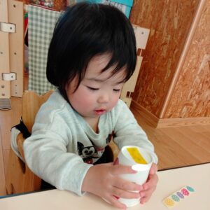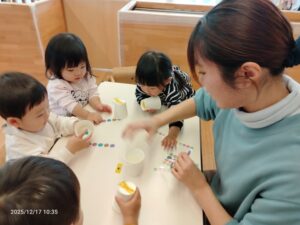 始めに紙コップにシールを貼り、飾りつけをしました。