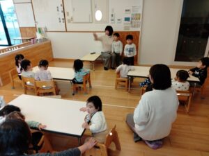「氷はなにでできているか?」「どんなところで出来るか?」などと質問すると、「おみず!」「冷蔵庫!」と答えていた子ども達。