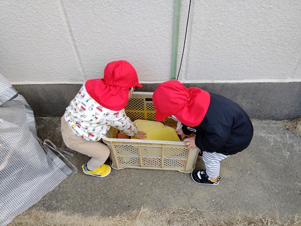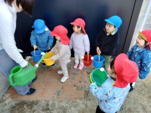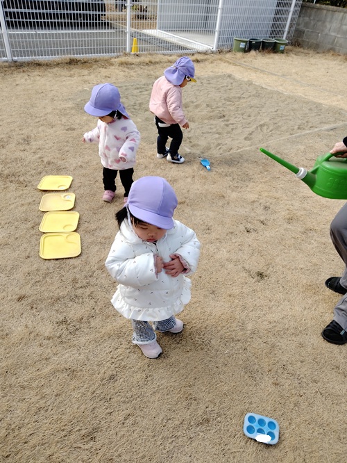 そこで、お水を容器に入れて園庭に置いておいたら氷ができるかの実験をしてみることにしました!