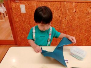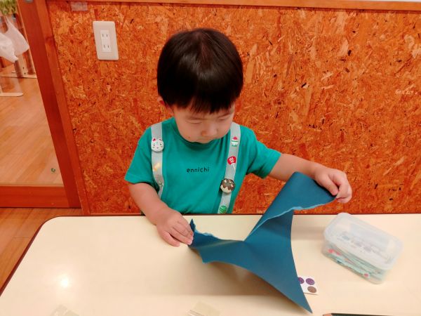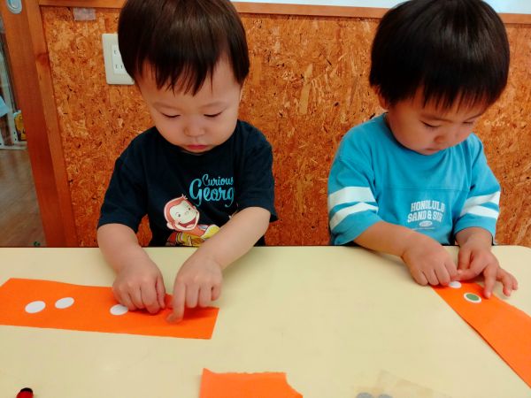 目の数や色は子ども達がそれぞれ好きなように選び、楽しく貼ることができました♪