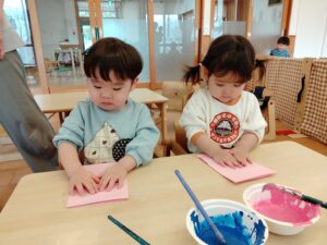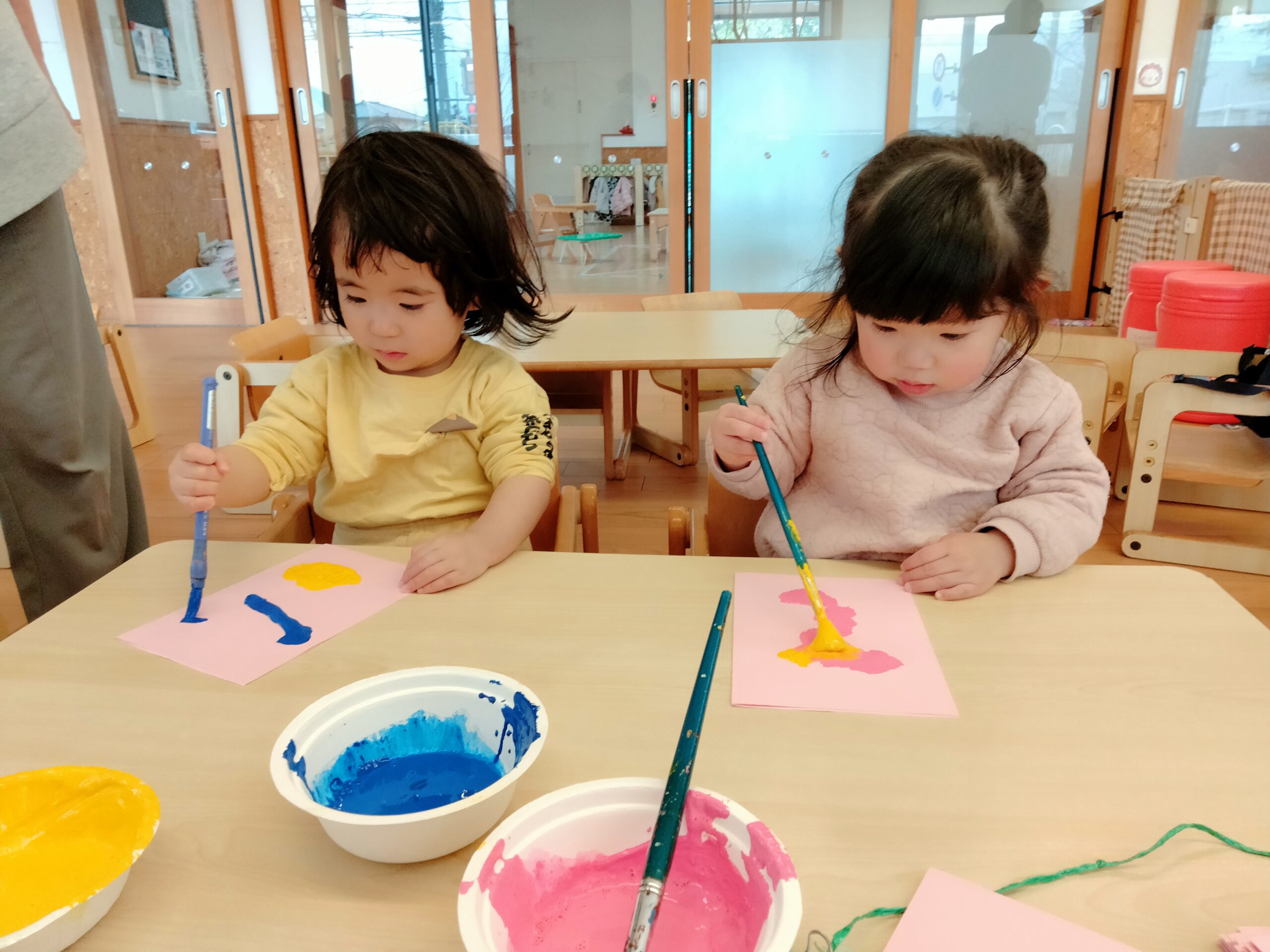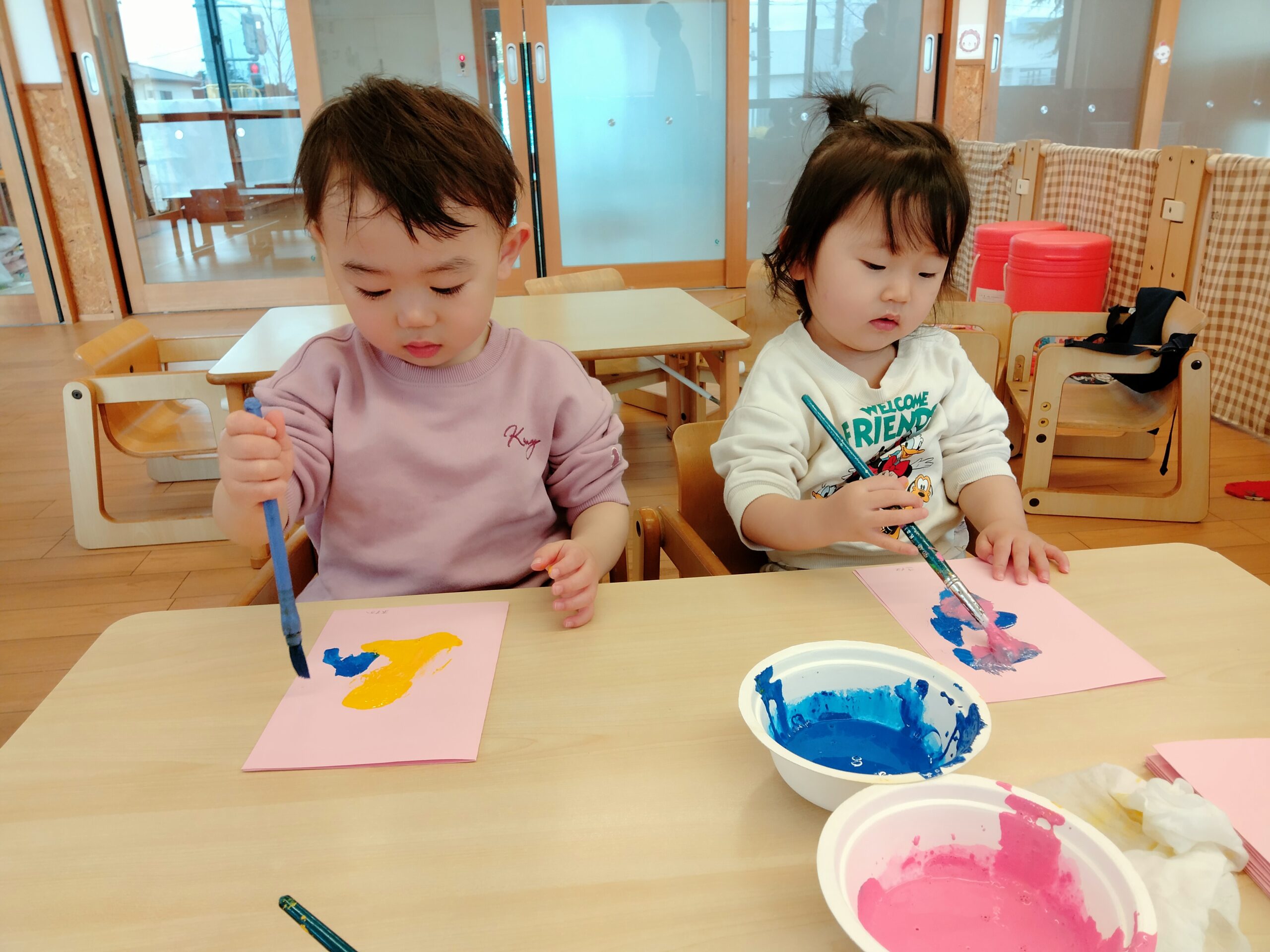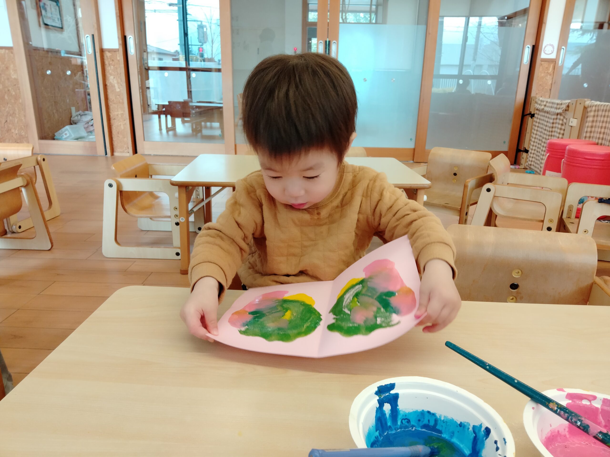 2026年2月26日 / 最終更新日時 : 2026年2月26日 simbatakabablog お知らせ 製作楽しいな♪ 3月の壁面作りを行いました。 今回は合わせ絵です! 絵の具を準備していると、集まってくる子ども達。 なになに~? 今回は3色準備して、子ども達が好きなように絵を描いてもらいました。 この色に決めた! 自分で筆を持ち、自分で描いています。 真剣な表情です。 ゴシゴシゴシ! 最後はアイロンを手でしっかりかけ、自分で画用紙を開きました。 ジャーン! 「すごーい!」と大喜びな子ども達。 完成した作品は可愛い蝶々になります♪